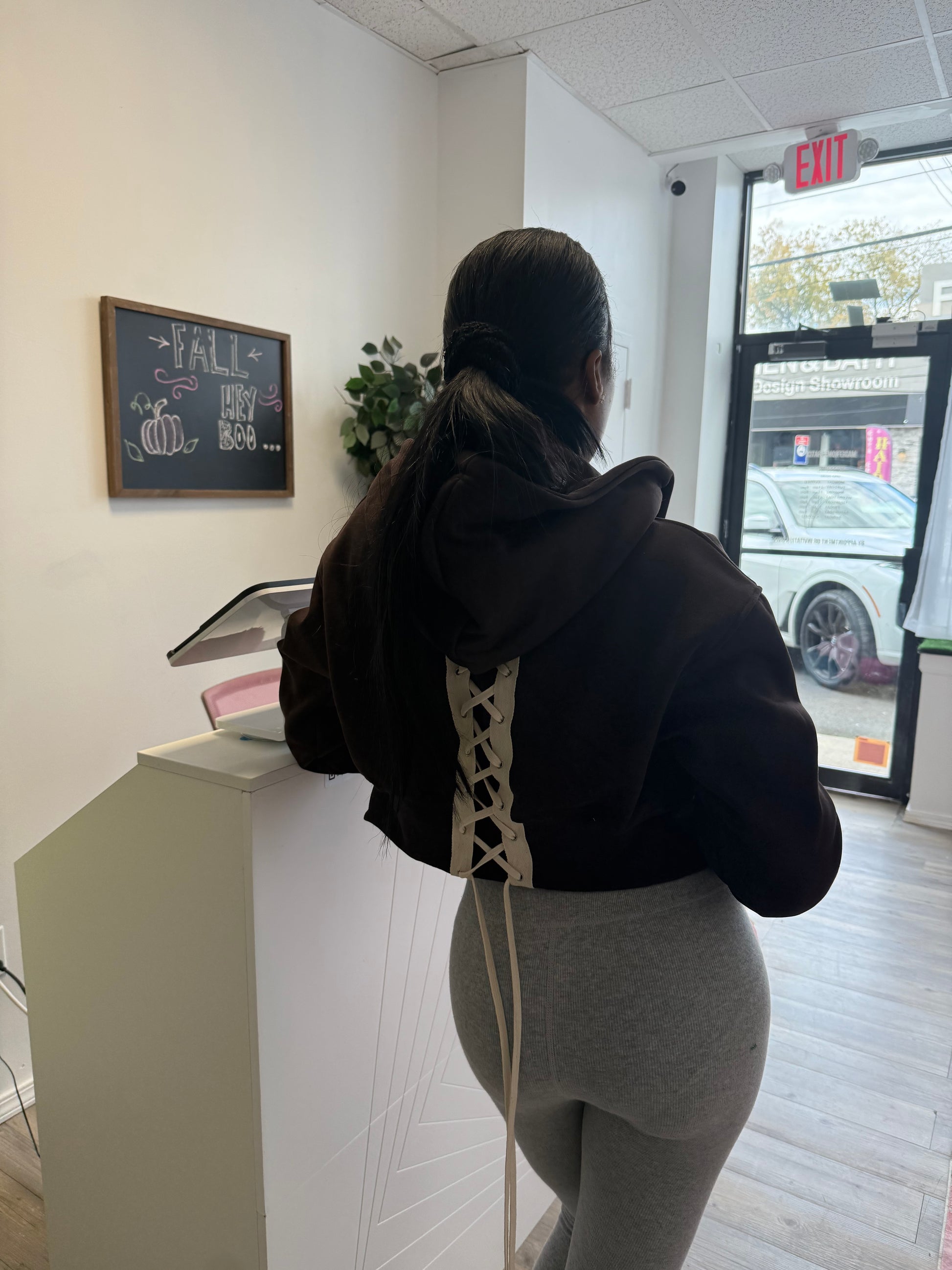 Elevate your off-duty look with our signature Chestnut Corset Hoodie — a perfect blend of structure and softness. Crafted in a deep chestnut tone, this cropped zip-up features a statement lace-up back detail with adjustable ivory ties for a feminine edge. Made from ultra-soft, heavyweight cotton fleece, it hugs your shape while keeping you cozy. Pair it effortlessly with matching leggings, sweatpants, or denim for a sleek, elevated streetwear vibe.